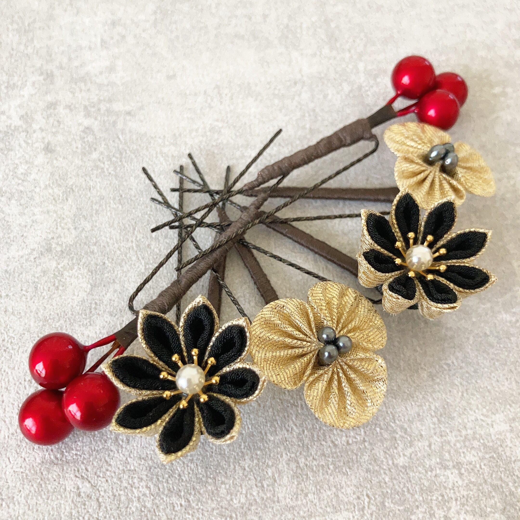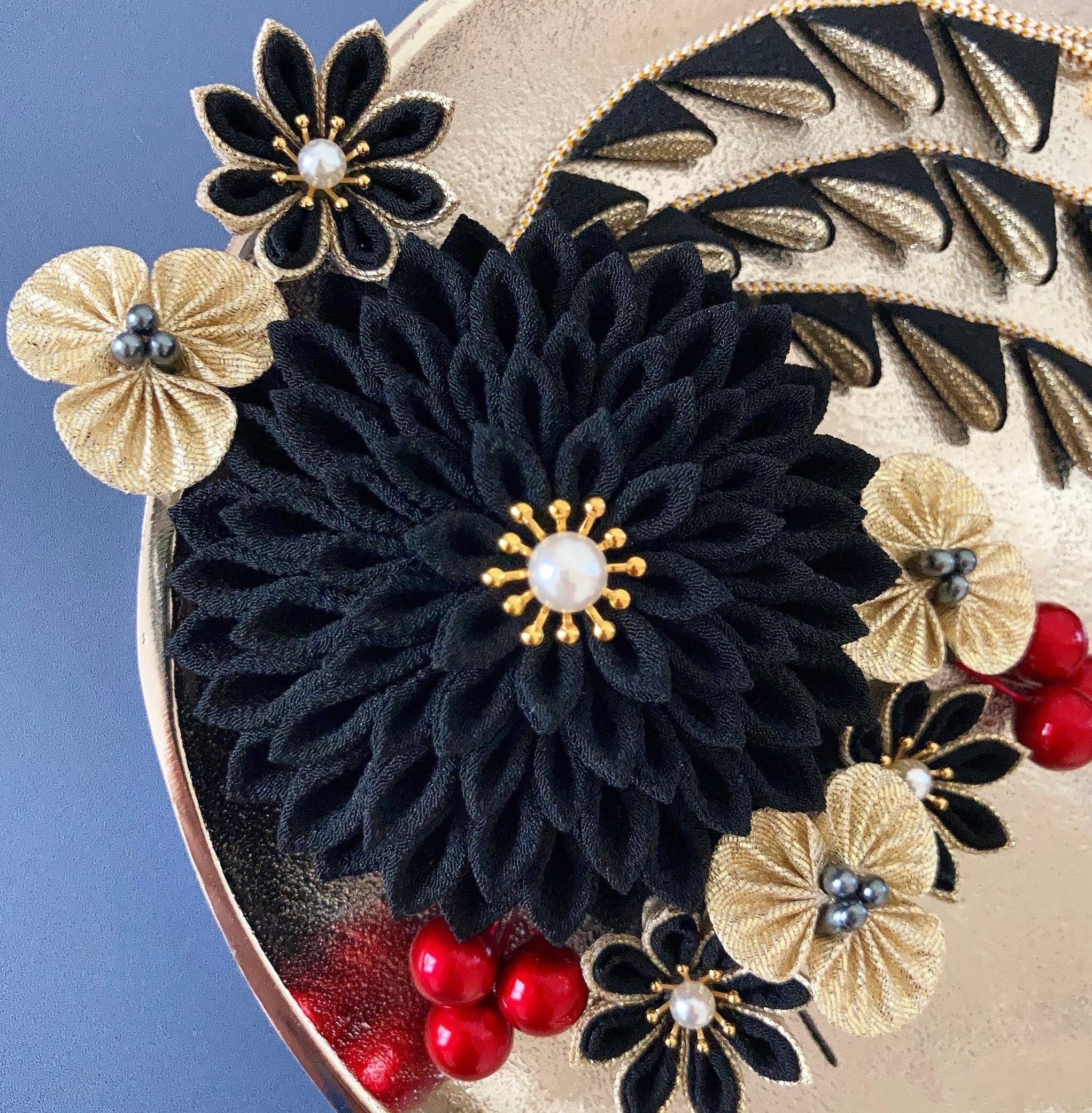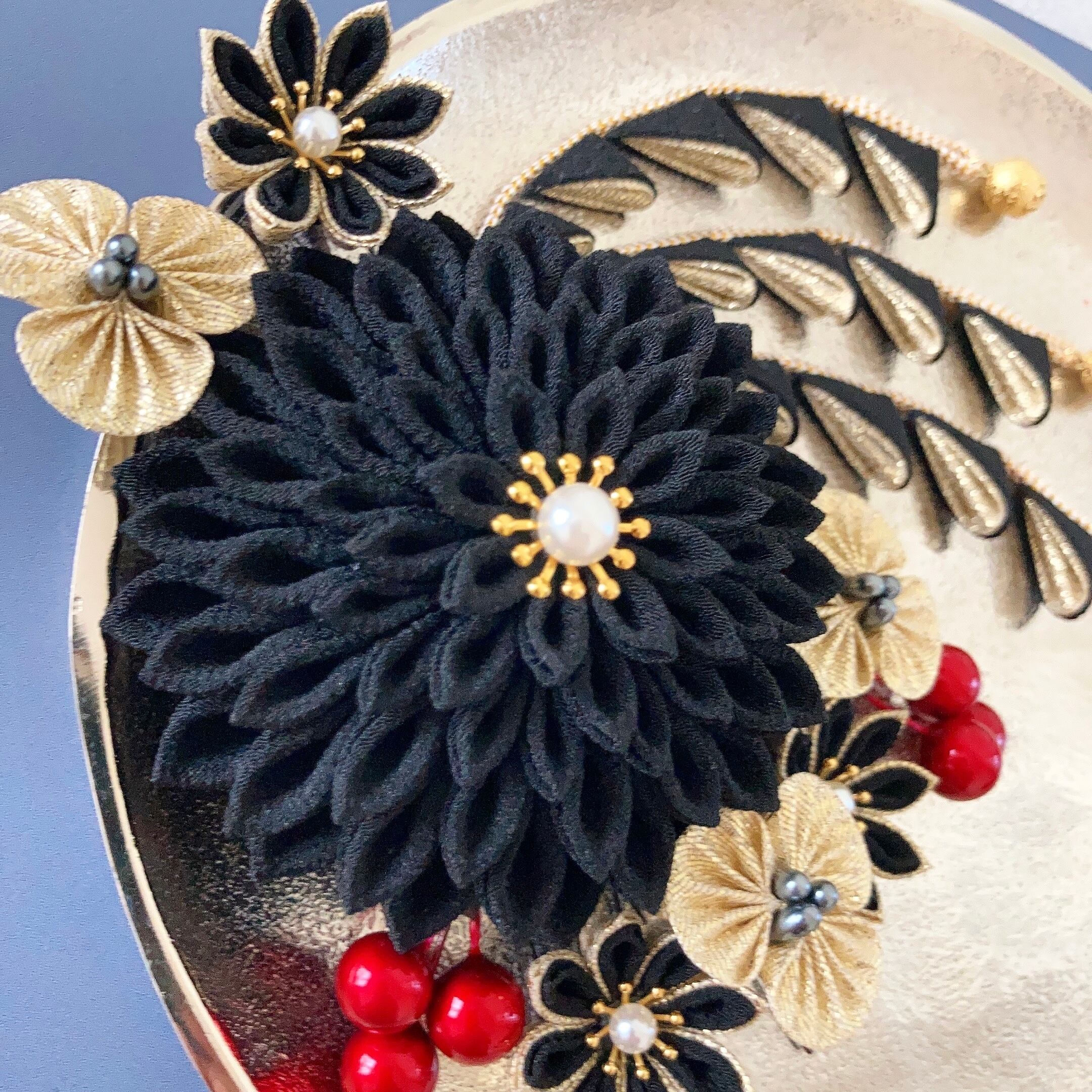 シックな髪飾り*黒♩【つまみ細工髪飾り】和装 着物 振袖 袴 色打掛け 黒 ゴールド 赤