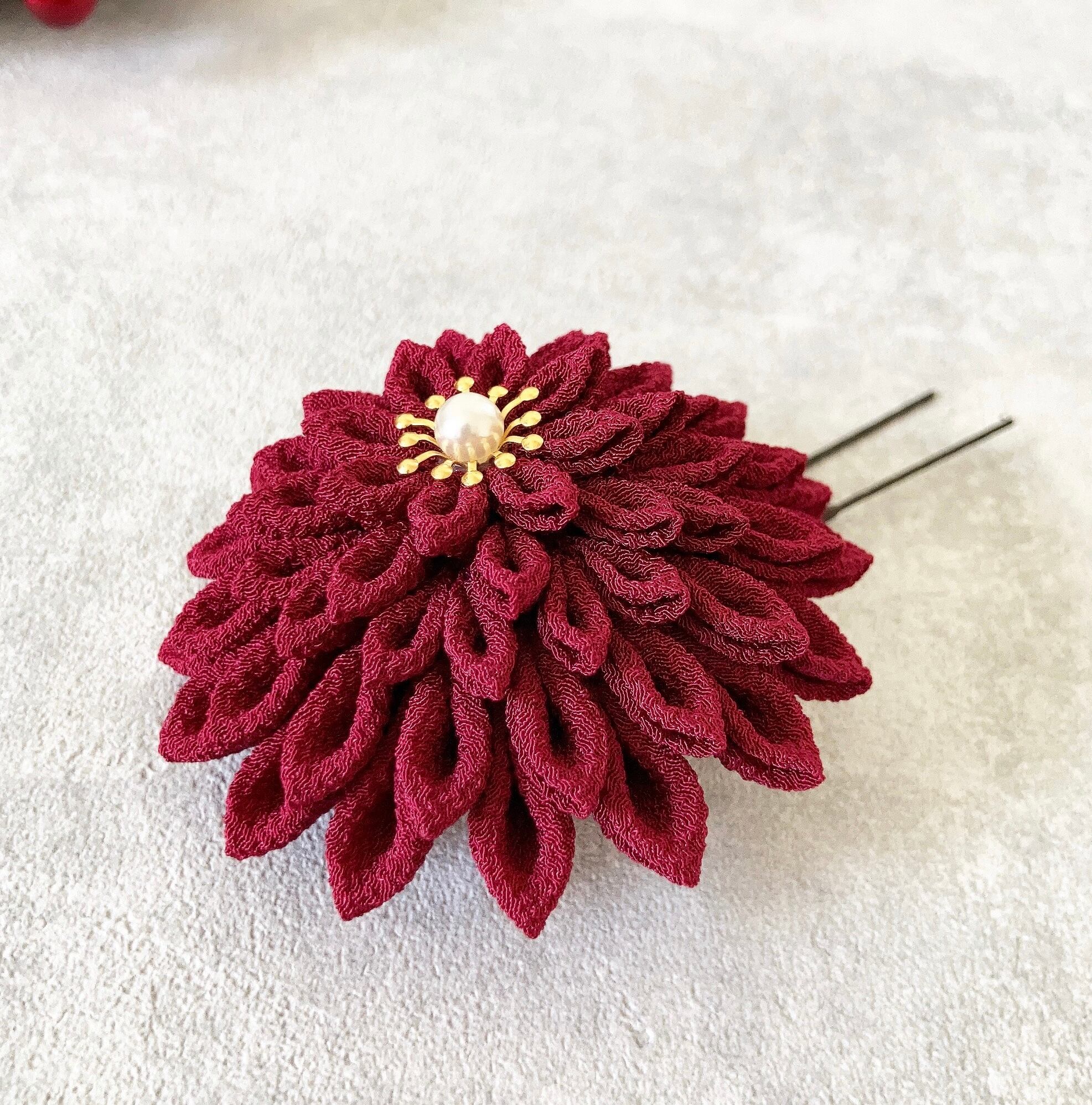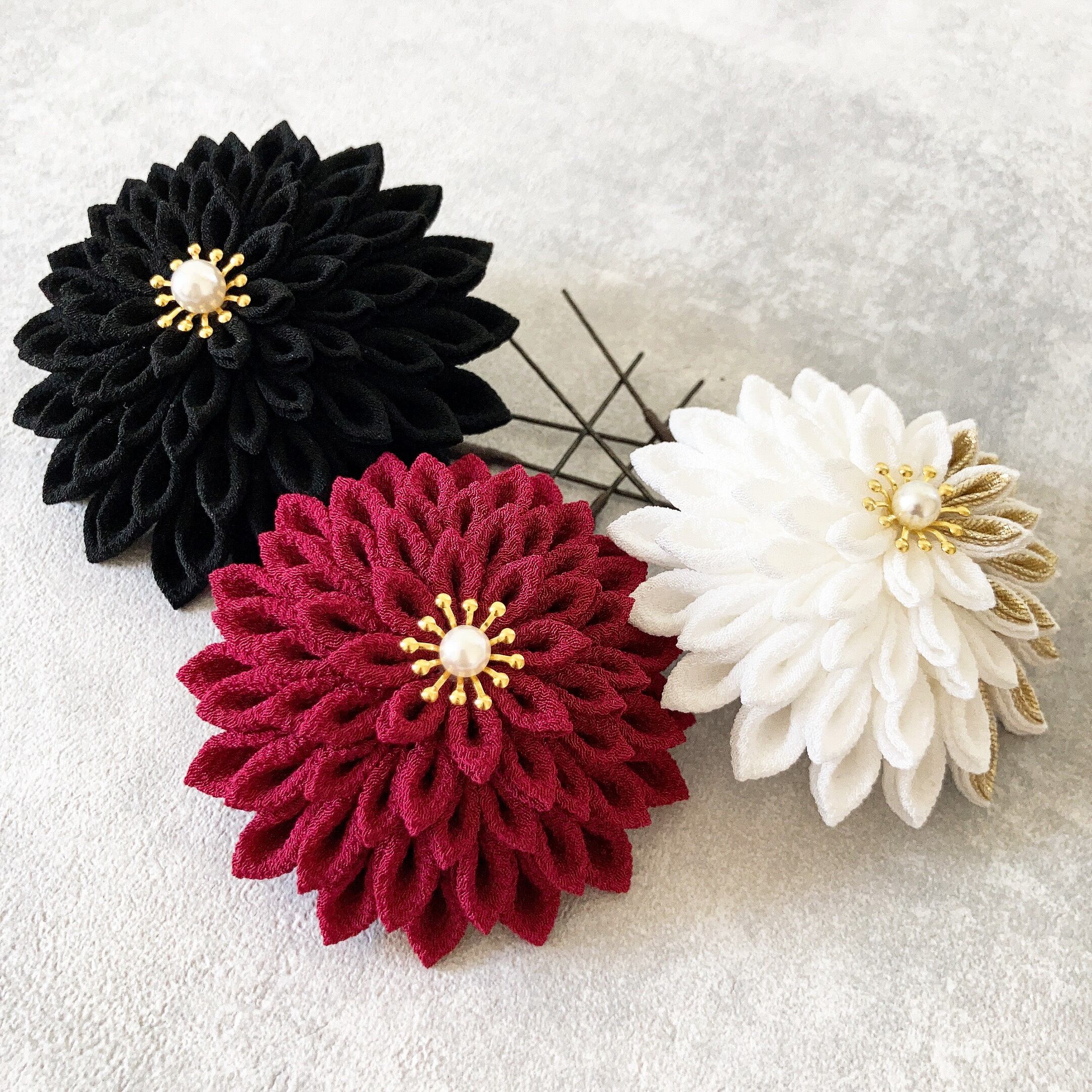 黒ダリアでカッコ良く♩【つまみ細工髪飾り】着物 振袖 袴 色打掛け 黒 白 ワインレッド ゴールド