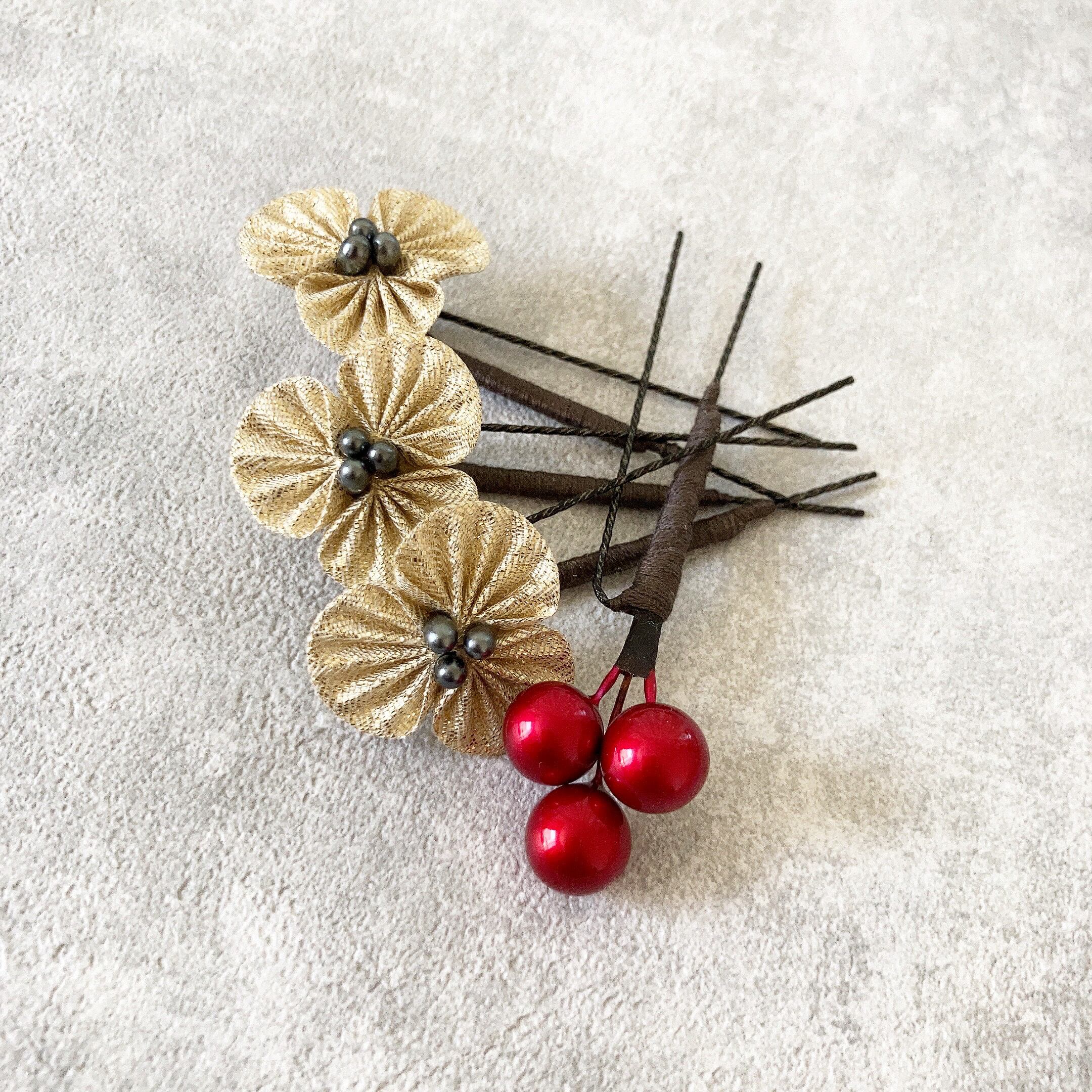落ち着いたカラーですが、ゴールドの小花をたくさん散らすことで、とても華やかで大人っぽくい髪飾りになりました。