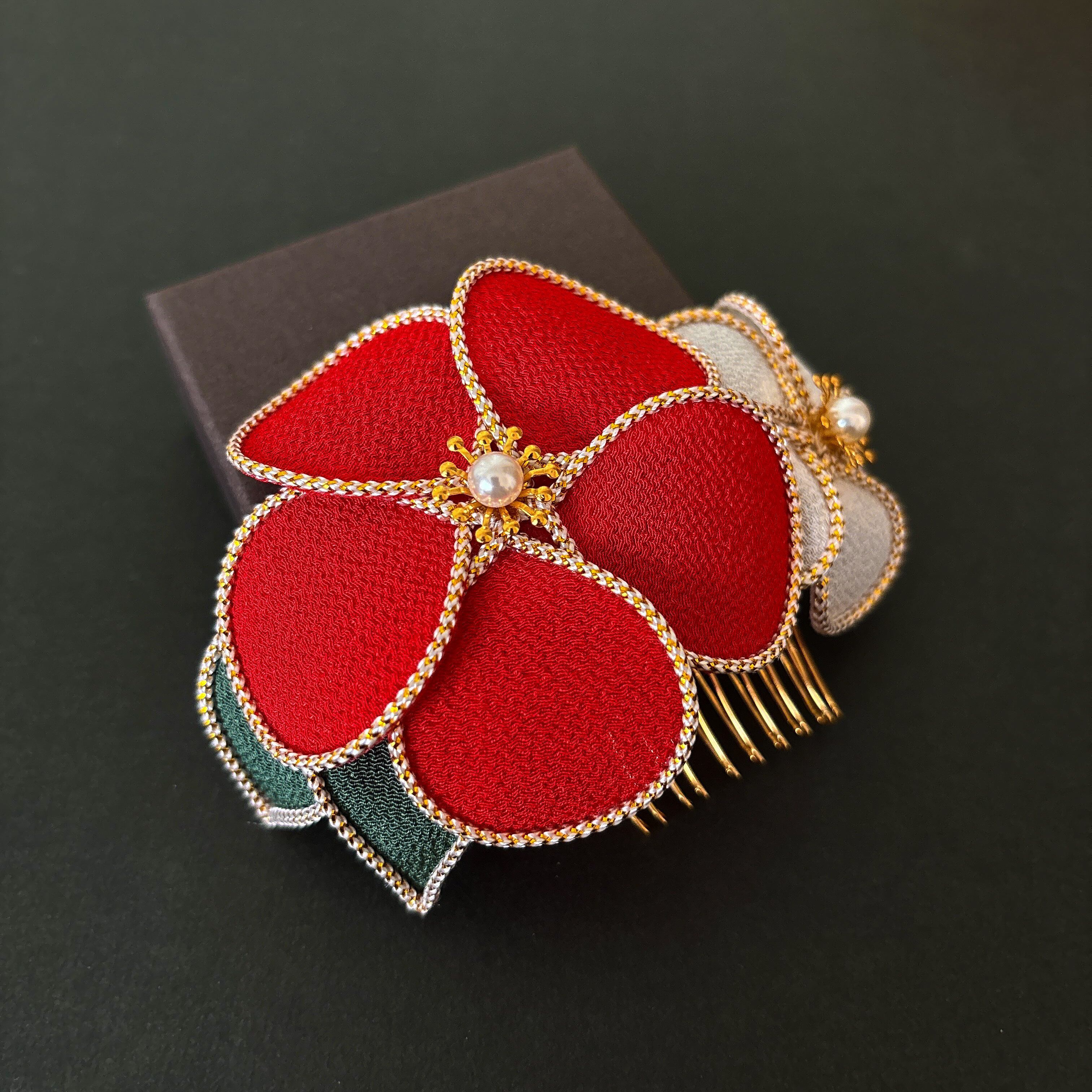 椿の髪飾り*つまみ細工コーム 着物 和装 振袖 袴 浴衣 赤 白