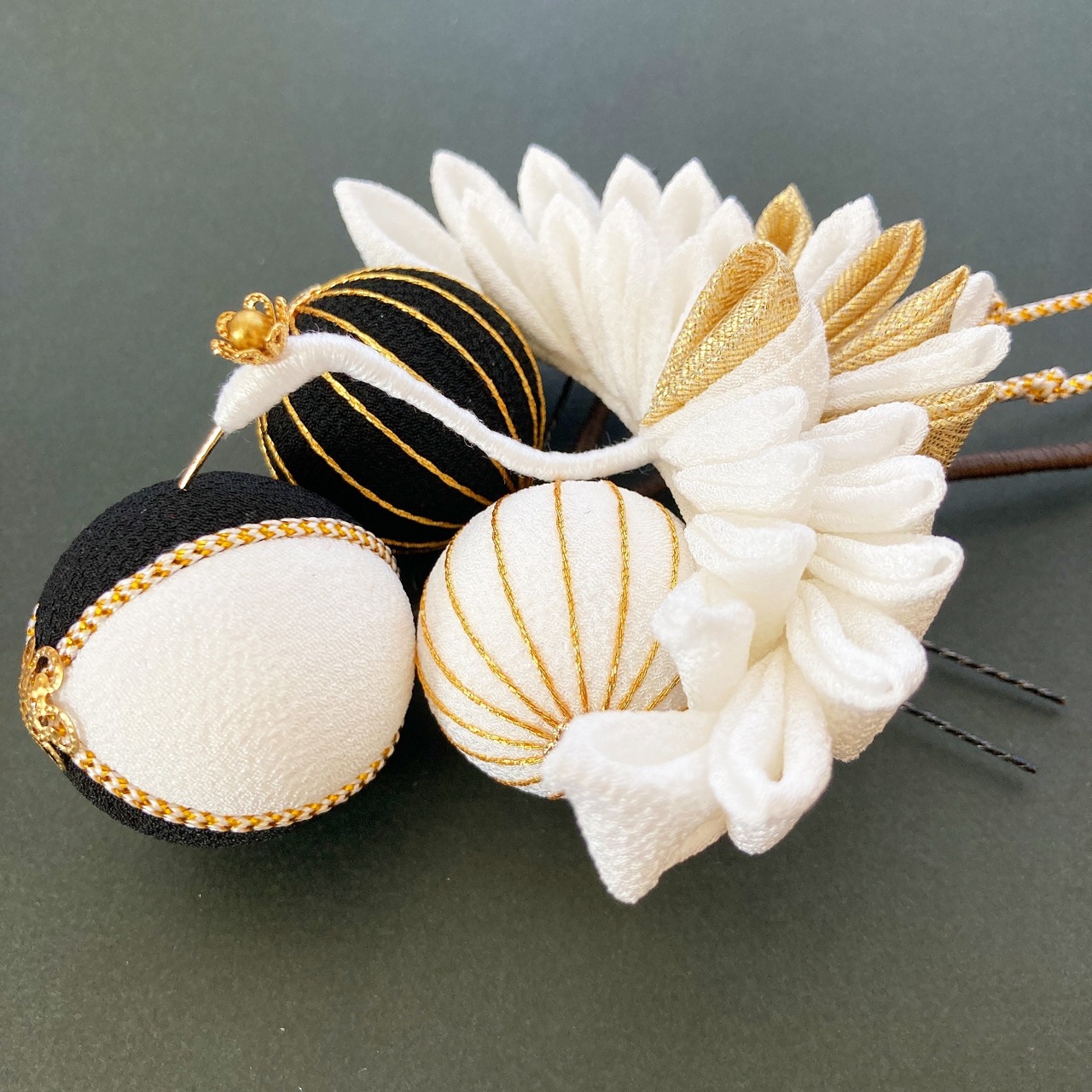 【Tsuru】つまみ細工髪飾り 着物 振袖 袴 打掛け 成人式 卒業式 結婚式 白 ゴールド