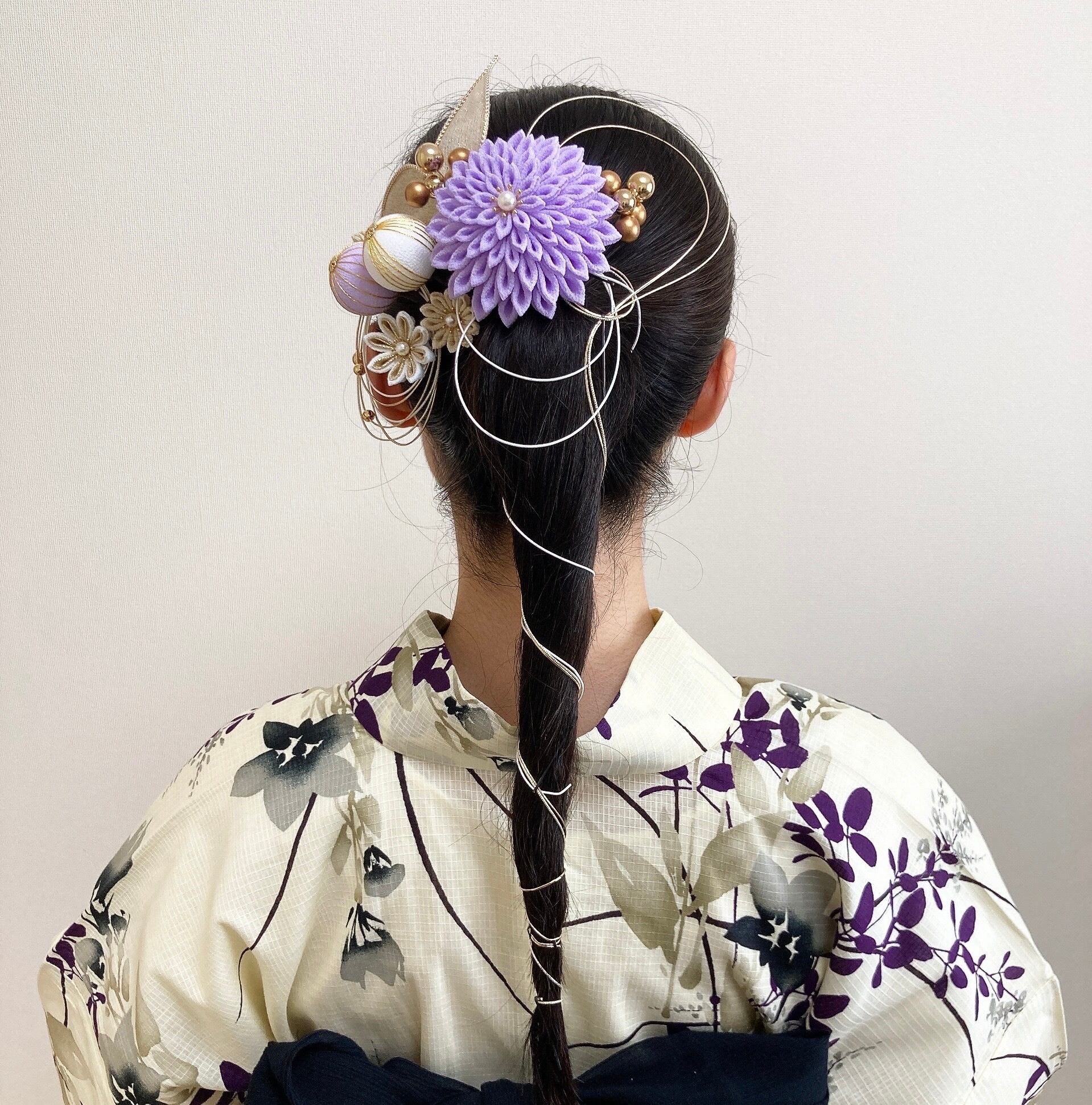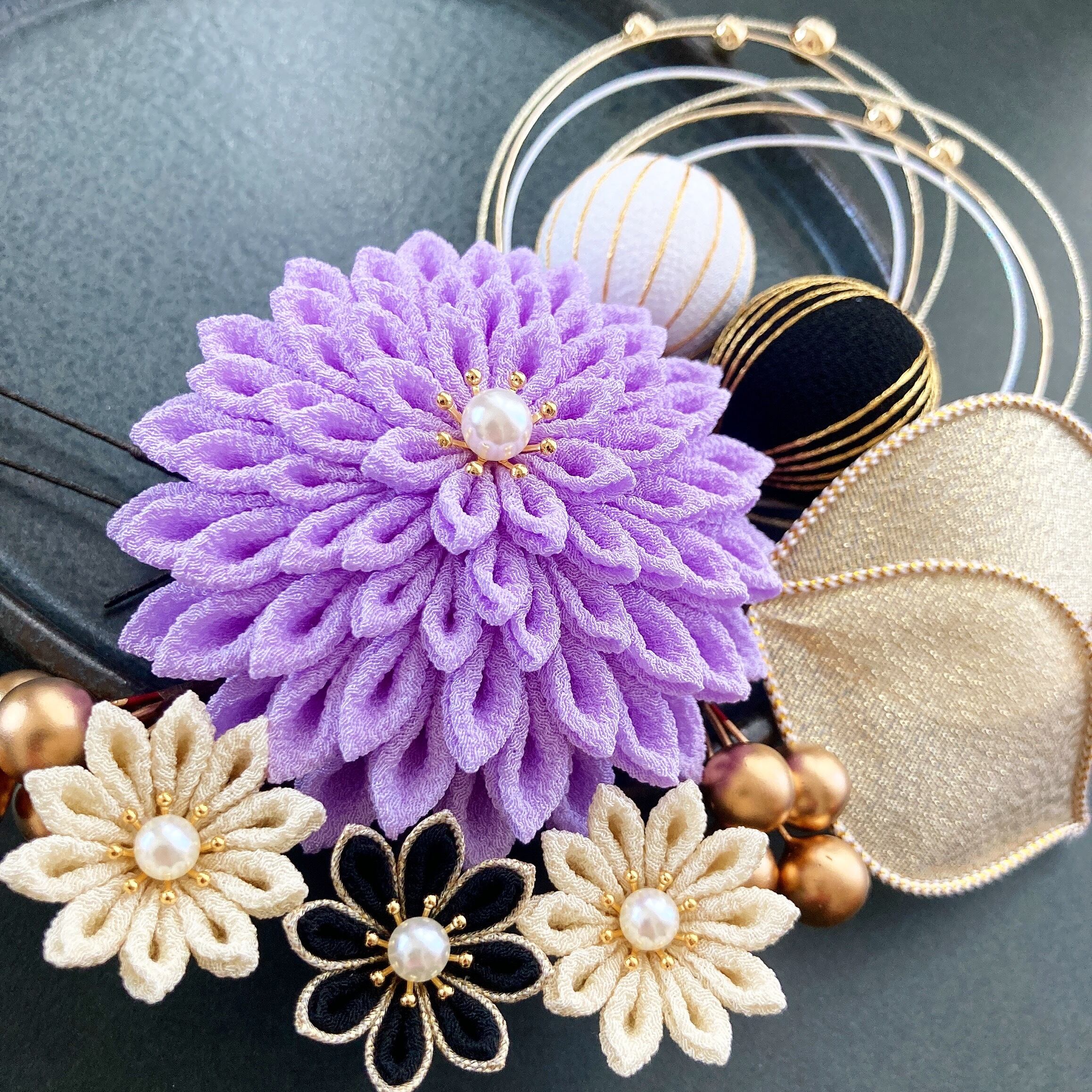 つまみ細工髪飾り 紫 ラベンダー 和装 着物 振袖 袴 色打掛 成人式 卒業式 結婚式 黒 ゴールド