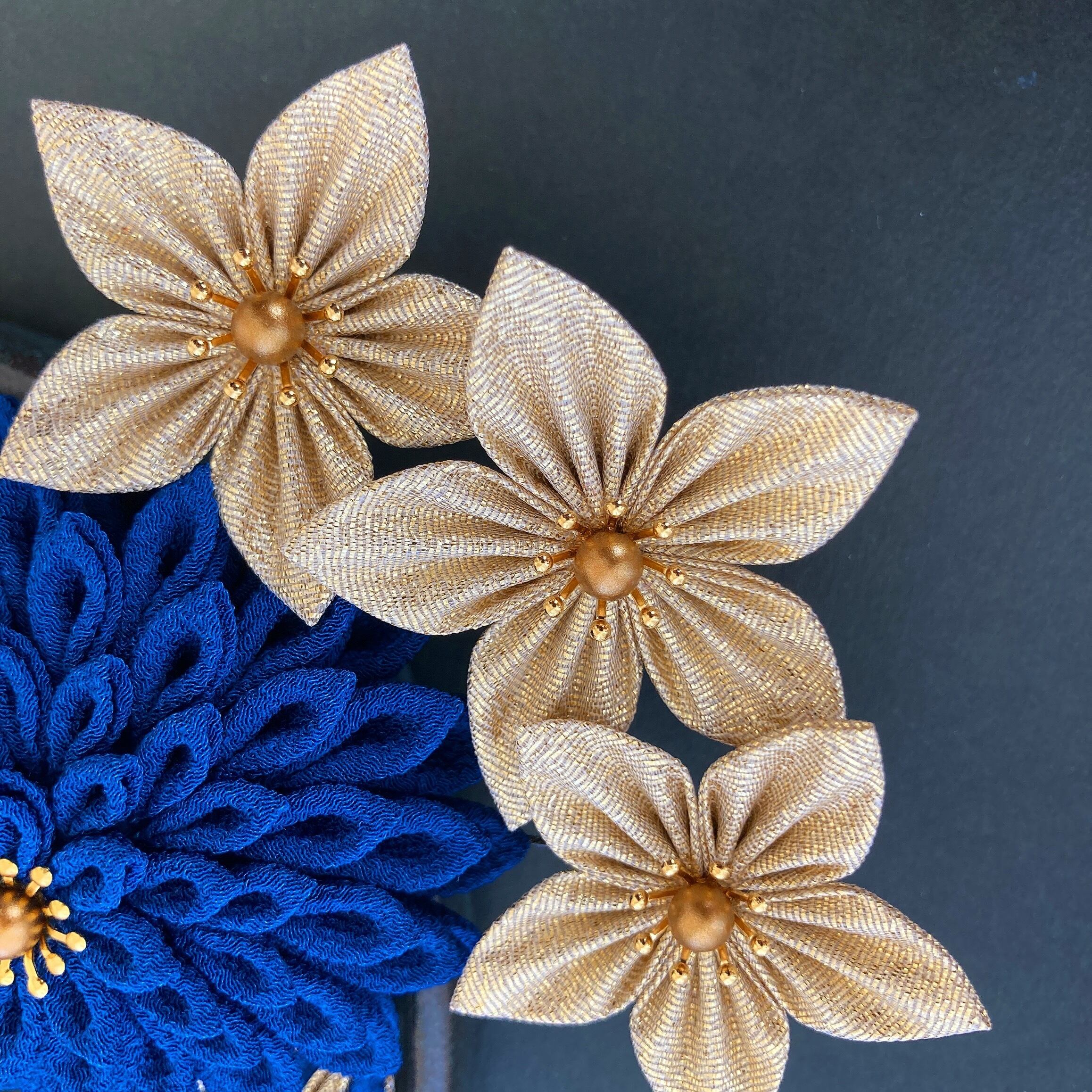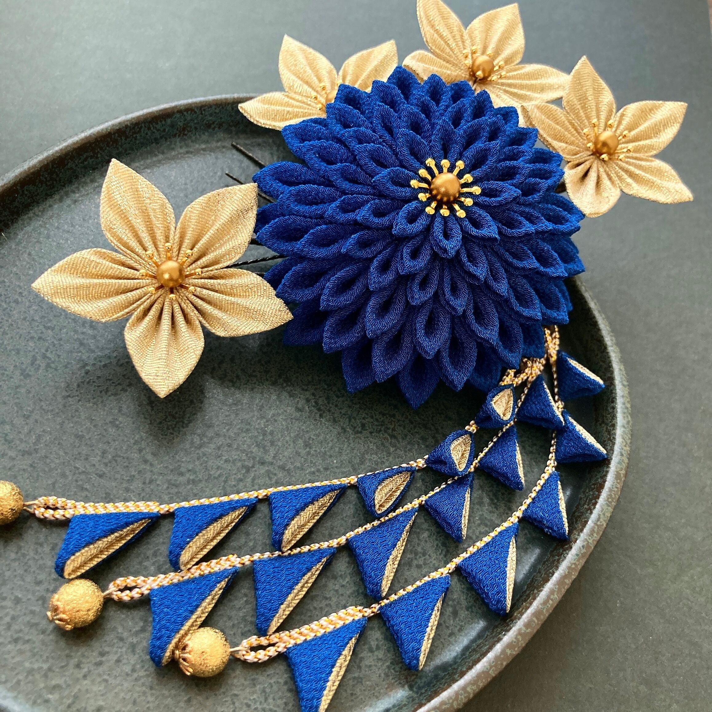 つまみ細工髪飾り 和装 着物 振袖 袴 色打掛 成人式 卒業式 結婚式 青 ゴールド