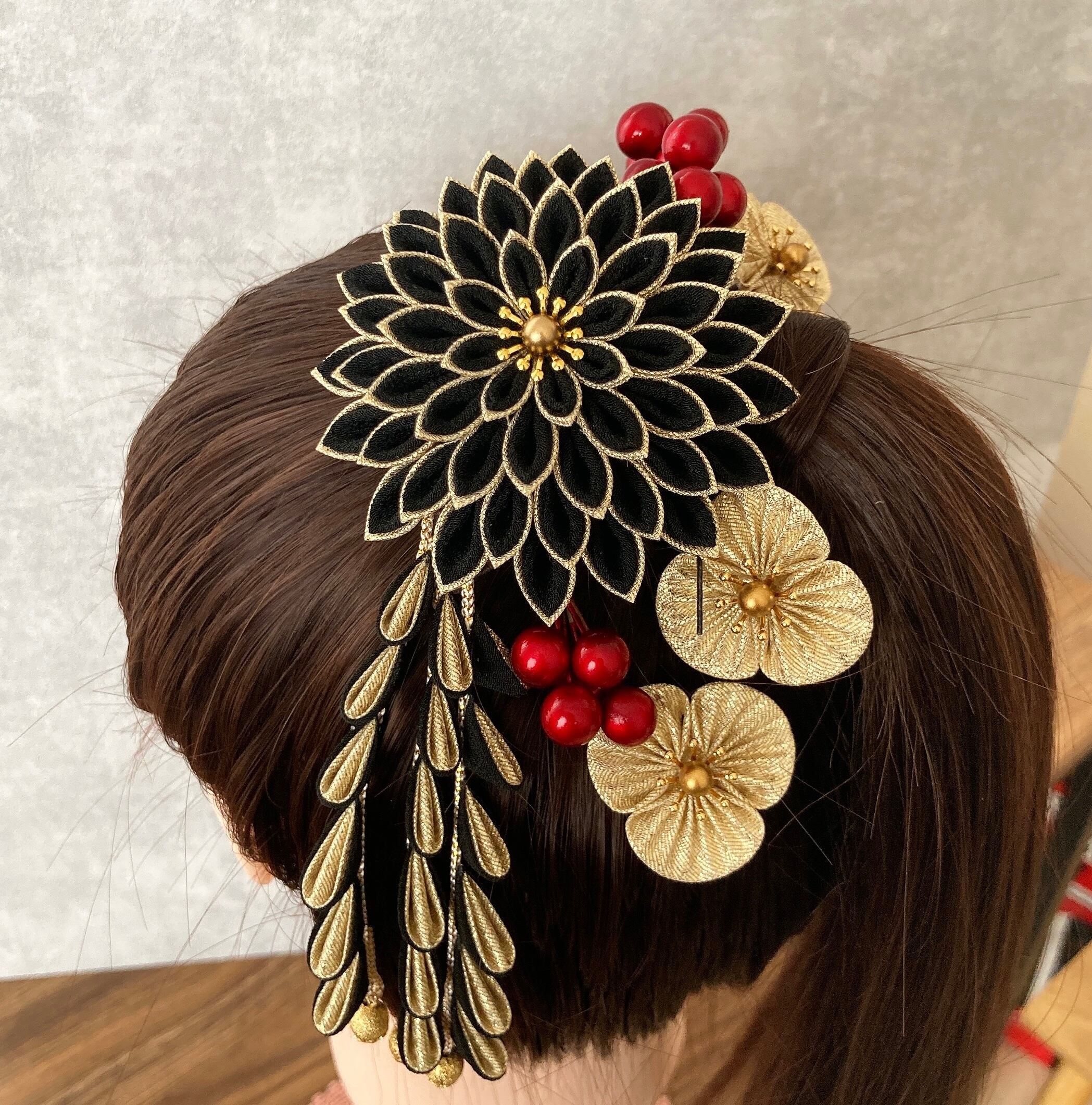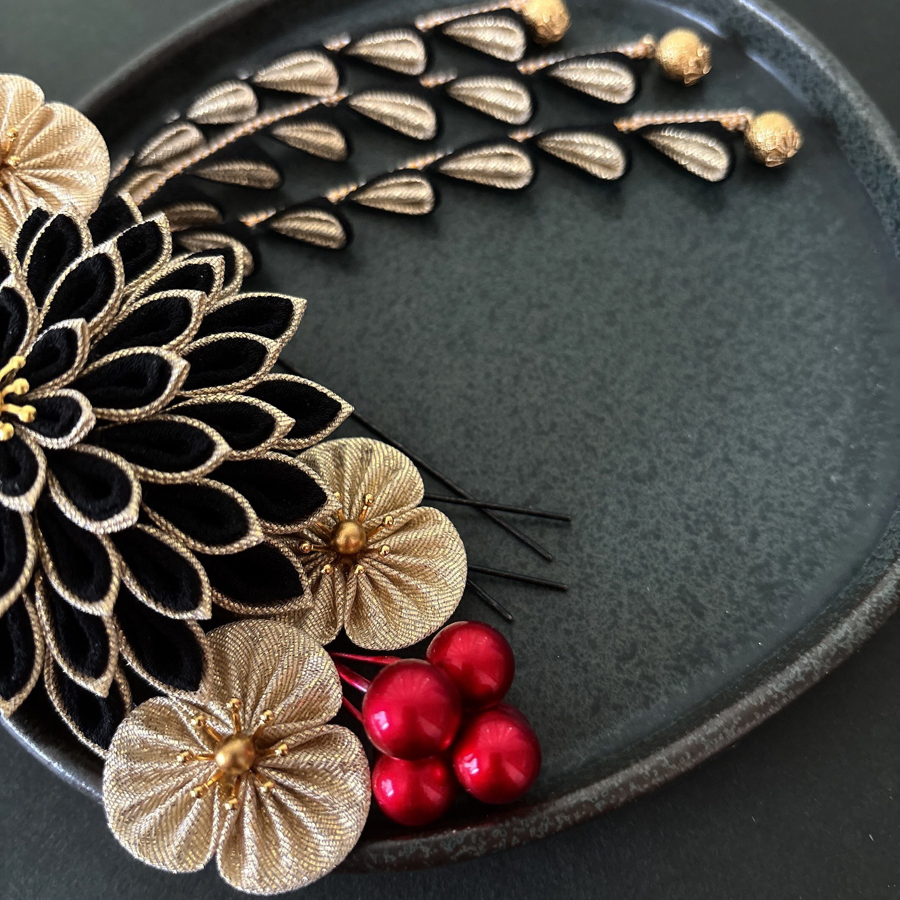 つまみ細工髪飾り 黒 ゴールド 和装 着物 振袖 袴 色打掛 成人式 卒業式 結婚式