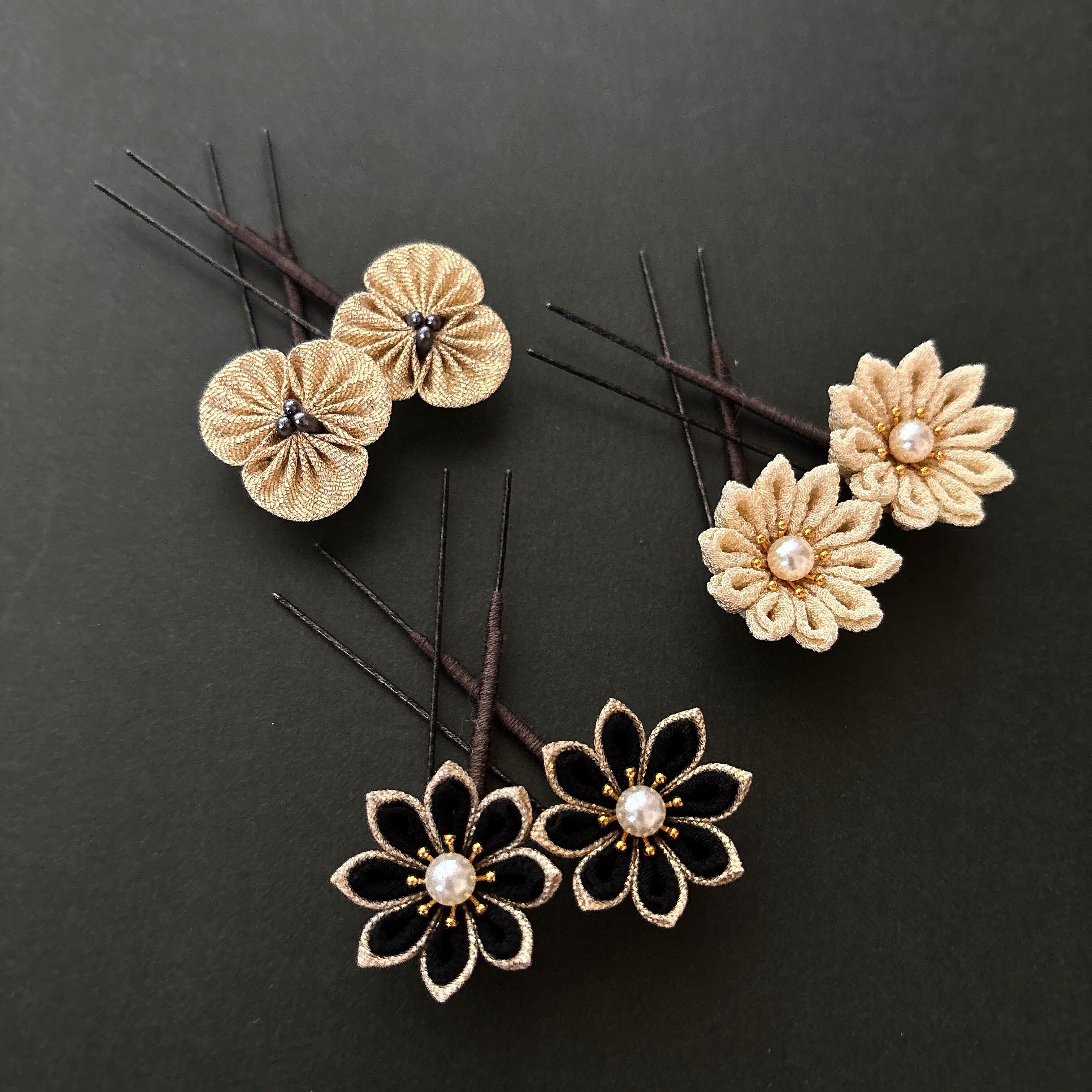 つまみ細工髪飾り 赤 深紅 和装 着物 振袖 袴 色打掛 成人式 卒業式 結婚式 赤 黒 ゴールド